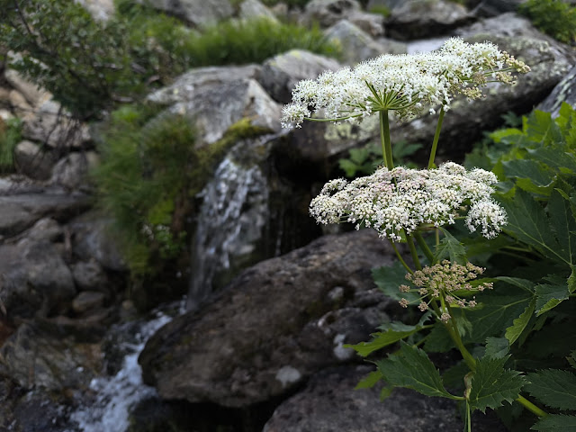 Hoy serán tropecientos collados y una larga caminata por cotas entre los 2200 y los 2500 metros. Aquí es volver a sentir con fuerza el placer de caminar. Se respira un aire de montañas solitarias, paisaje cambiante de prados de un brillante verde sobre un fondo de serradas crestas de granito y, tras el primer collado, un hermosísimo paraje de praderías todas rodeadas de montañas que la niebla oculta a ratos. Al fondo, el collado al que se dirige el sendero está fuertemente defendido por bastiones rocosos por donde no logro saber cómo se las va a apañar el sendero para subir. Empinado, pero se sube. Un buen trozo a cuatro patas, pero sin problemas.