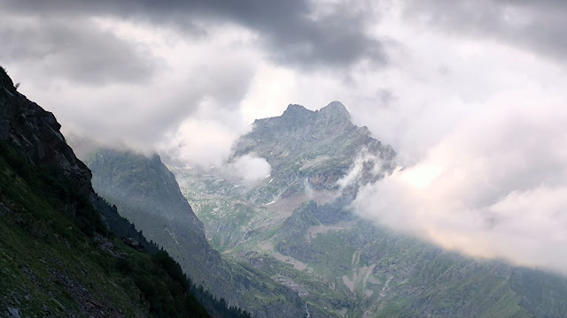 Al otro lado del collado Lazoney se abre un nuevo espectáculo de montañas. Al poco comienza a llover. Un buen rato. Después vuelve a salir el sol.