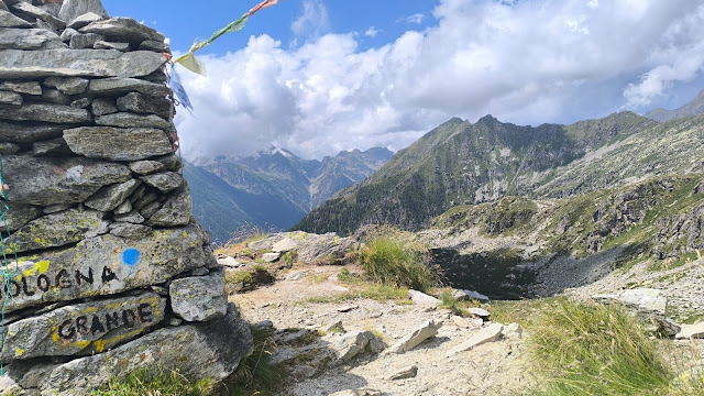 Pese a la largura de la jornada es placentero este descenso entre prados y lagos. El frente del valle lo ocupan prominentes cumbres que al atardecer, desde mi tienda, ofrecerán un bello espectáculo de tonalidades grises donde el efecto de las nubes cubriendo y mostrando a retazos las montañas compondrán un espectacular cuadro con el que terminar el día.